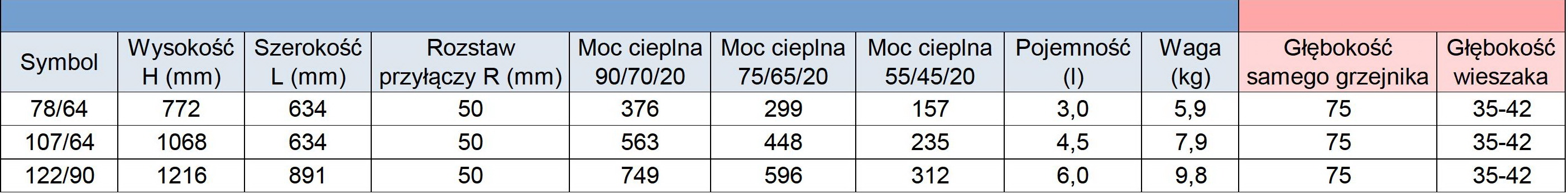 Parametry grzewcze grzejnika w zależności od typu instalacji: