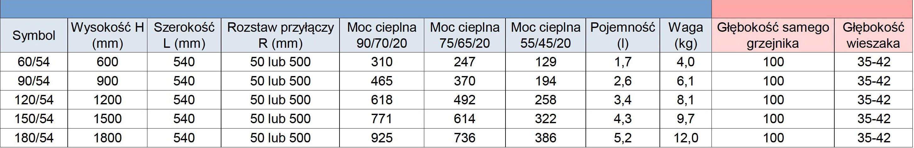 Parametry grzewcze grzejnika w zależności od typu instalacji: