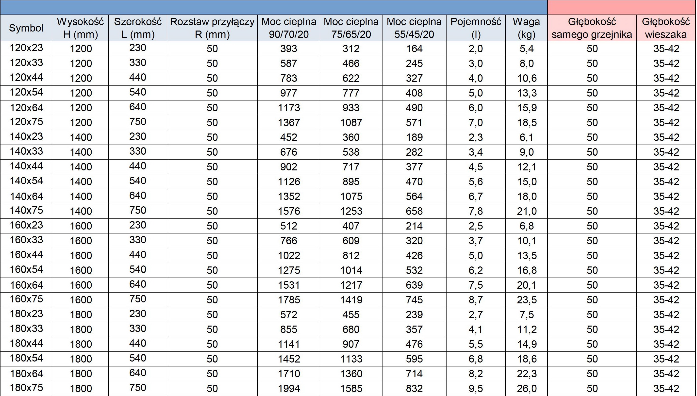 Parametry grzewcze grzejnika w zależności od typu instalacji: